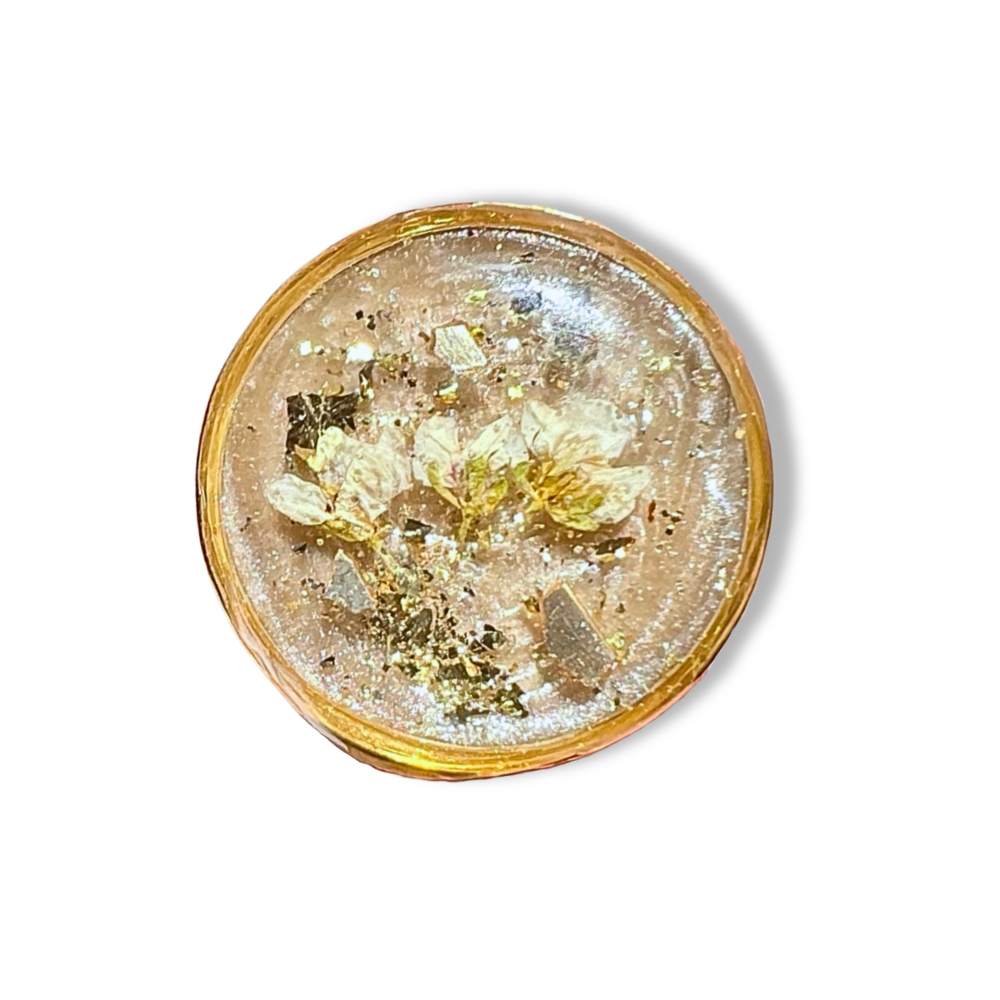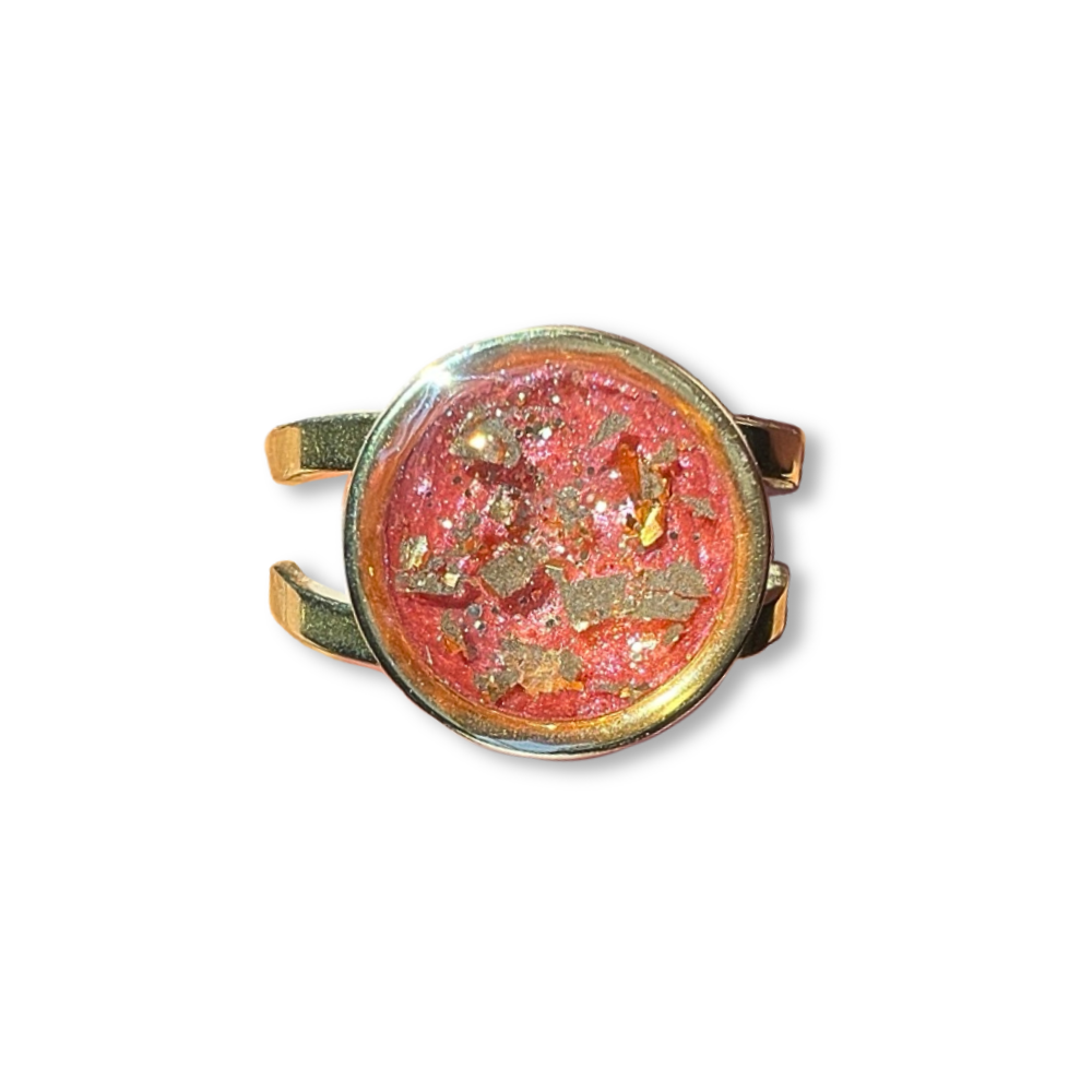 Experience the enchantment of our stunning Enchanted Forest ring! Handcrafted with resin, pigments, and golden foil flakes, this ring will add a touch of magic to your accessories.