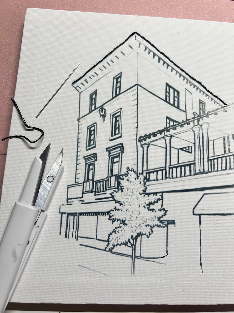 This embroidered portrait depicts parts of Main St. and Hinman's buildings in SE Evanston.
